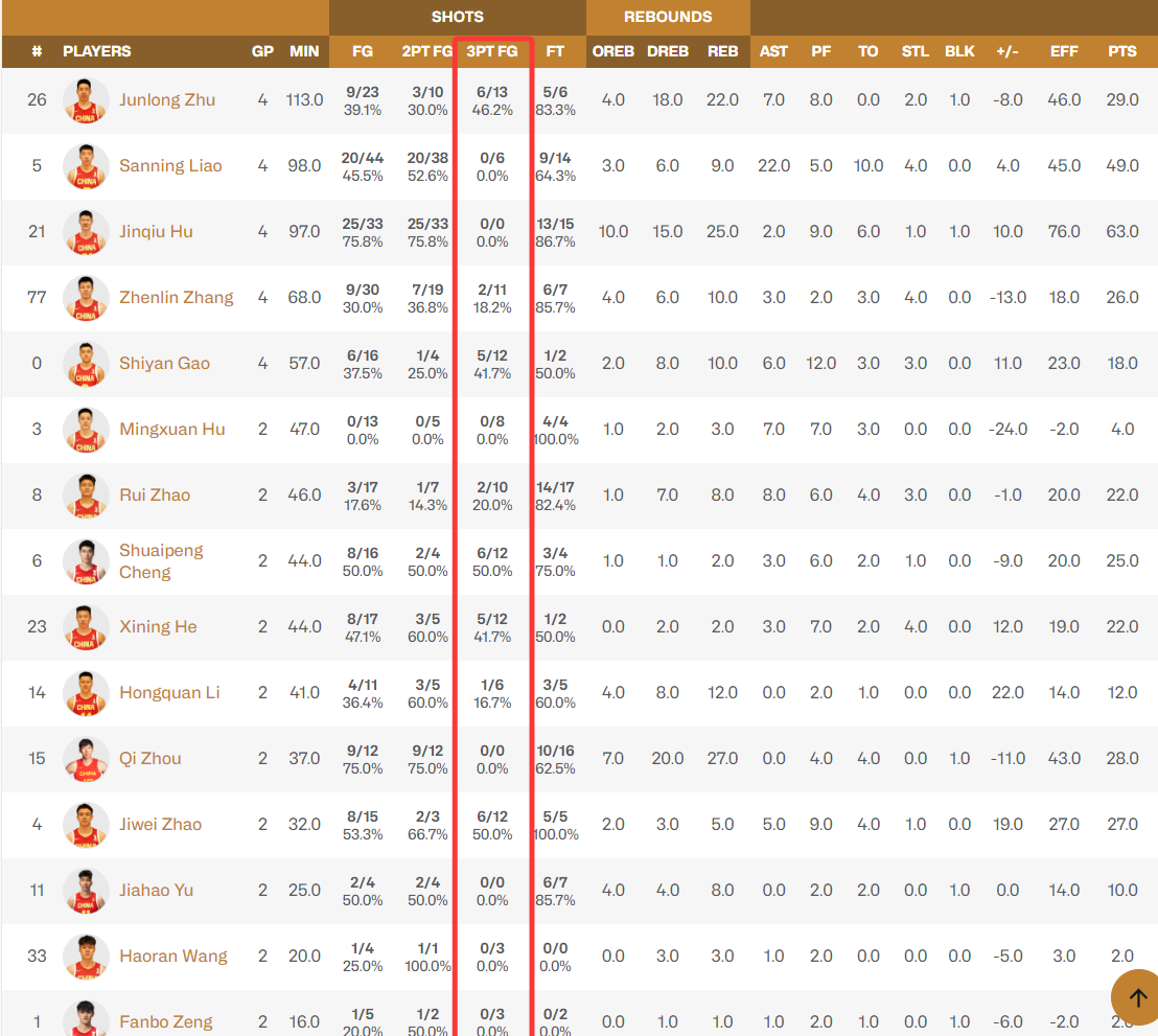 朱俊龙四场球三分13中6,程帅澎两场三分12中6,高诗岩4场三分12中5,贺希宁两场12中5,赵继伟两场12中6,这些球员都是三分投得非常出色的存在,可贺希宁与赵继伟两人不管是产量、命中率都在第一档。